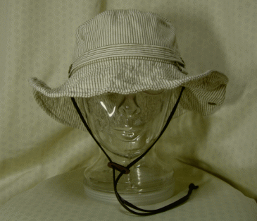 【ヒッコリーストライプ アドベンチャーハット】【アウトドア&カジュアル】綿100%ウォッシュ加工仕上げ、ヒッコリー&ベルト付きテンガロン系サファリハット<サイズ約59cm、身頃:生成×カーキストライプ>【紫外線対策商品】【熱中症対策】【トレッキング】
