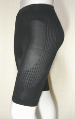 ウェスト中心からタテにステッチ、前身頃太もも部分クロスステッチ、 後身頃左右からヒップ下部分にぐるりとステッチ切替、ヒザ裏部分ななめにステッチ切替&サポート!