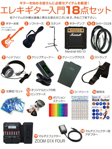 ギターを始めるにあたり、日々の練習に必要なアイテムを厳選した初心者16点スペシャルセット!名門アンプ「マーシャル」MG10をセットに加えロックテイスト溢れる本格セット登場! やはりスタートは肝心ですよね、ギターを弾くこと以外にも、チューニングや弦の交換など、多くの事を勉強する上できっとお役に立てるEbiSound自慢のセットです!全国送料無料! ※沖縄県への発送については別途送料を承っております。