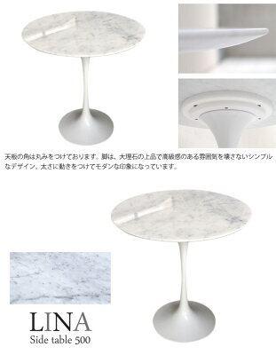 商品 リナ サイドテーブル500 サイズ 幅500× 奥行500×高さ515mm 素材 天板:天然大理石 脚部:スチール(紛体塗装) 生産 中国 組立式 - 備考 天板に天然の大理石を使用した、高級感のあるリナテーブル。