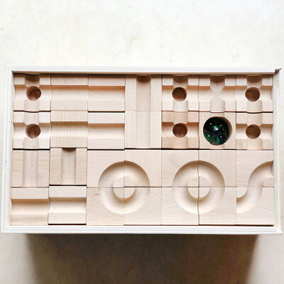 溝や穴の道はビー玉が通るサイズになっており、完成したブロックの道にビー玉を転がして遊ぶことが出来ます。