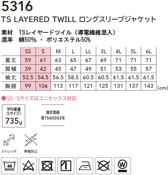 スペック メーカー TS DESIGN(藤和) 品番/シリーズ 5316 5314/531シリーズ シーズン 秋冬物 ※このシリーズの春夏対応シリーズはコチラ 商品名 ロングスリーブジャケット&メンズカーゴパンツセット(上下同色) 素材 TSレイヤードツイル(導電繊維混入) 混率 綿65%・ポリエステル35% 特徴・仕様 軽量、ストレッチ、形態安定性、2層構造糸、安心の日本製素材使用、マルチスリーブポケット、ペア企画 ※ロングスリーブジャケット:SS・Sサイズはレディースシルエットになります。